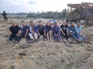 Acting on this critical lead, operatives tracked and apprehended nine (9) Chinese nationals, all male, and escorted them to multiple sites for on ground corroboration of their involvement. At these locations, officers documented degraded sections of the Bia River and dismantled makeshift mining structures that had served as accommodation and processing shelters. Several of these structures were destroyed to prevent any attempt at re occupation.